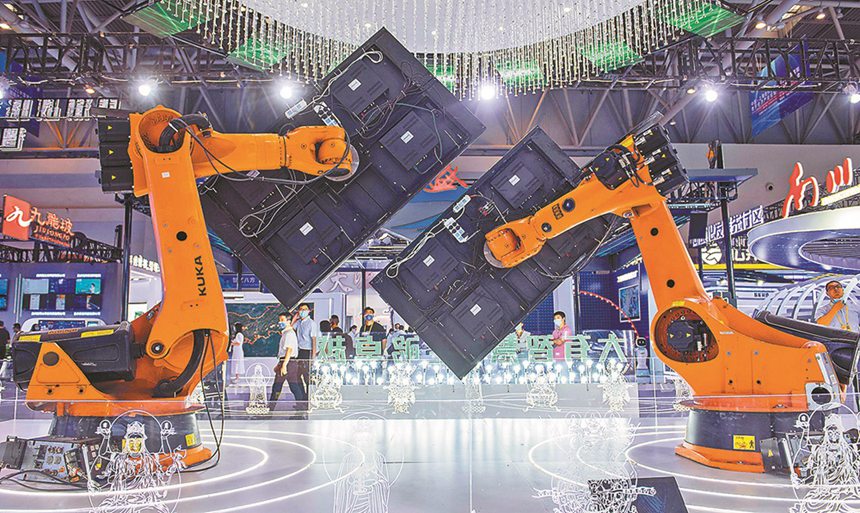 八月二十三日,在重慶國際博覽中心,二○二一中國國際智能產業博覽會展場,兩臺機器人“揮舞”著顯示屏進行視頻組合展示智能制造。記者 張錦輝 攝\視覺重慶