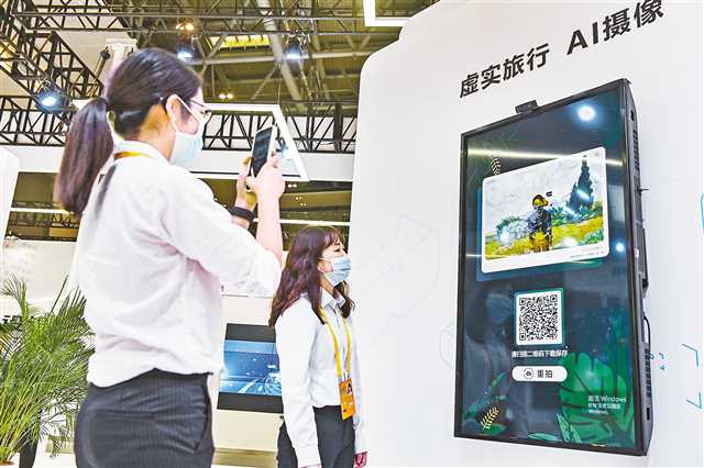 “在最喜歡的畫里跟最喜歡的藝術家同框,真是不枉此行!”在華為展臺搭建的智慧文旅場景中,一位女士點擊名畫《星空》,站在“虛實旅行”AI攝像頭前與作者梵高一起在屏幕上被定格成畫中風景。