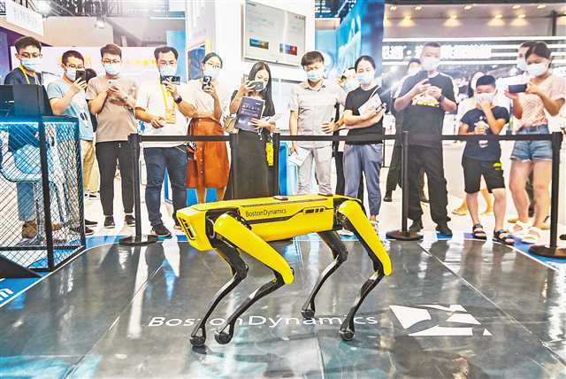 8月24日,重慶國際博覽中心,智博會展場中央展館,市民正在觀看英特爾機器狗跳舞。首席記者 龍帆 攝/視覺重慶