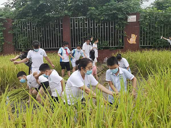 正在割谷子的學生驚喜發現稻田里的魚 江津區教委供圖