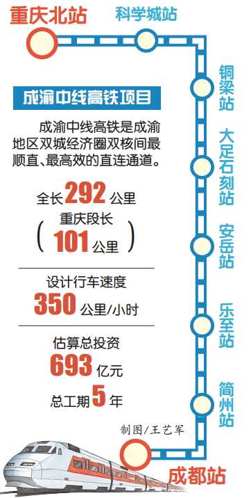 成渝中線高鐵是國家“八縱八橫”高鐵網滬渝蓉沿江高鐵大通道的重要組成部分,也是成渝地區雙城經濟圈雙核間最順直、最高效的直連通道。成渝中線高鐵項目全長292公里,重慶段長101公里。全線共設站8座,線路從重慶北站引出,沿線新設科學城站、銅梁站、大足石刻站、安岳站、樂至站、簡州站,接入成都站。設計行車速度350公里/小時,估算總投資693億元,總工期5年。