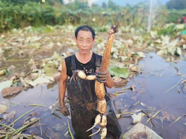 “我們利用本村的閑置土地,租用了90多畝的土地開荒種藕,土地費一年500塊錢一畝,年終還有分紅。村里總的閑置土地有兩百多畝,藕田90多畝,稻谷100多畝,現在稻谷已經收完了。今年稻谷收益和蓮藕的產量都挺好。三畝多地,賣了接近一萬塊錢了!贝竽ゴ宕逯Р扛睍浝孜挠⒄f。(劉政寧、黃亞輝、李拉拉)