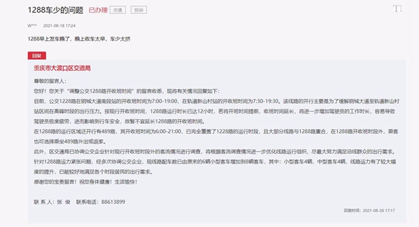 針對網友的留言,大渡口區交通部門及時做出了調整,并給網友回復:1288路運行時長已達12小時,若將開班時間提前,收班時間延長,將進一步增加駕駛員的工作時長,容易導致駕駛員極度疲勞,進而影響到行車安全,故暫不宜延長1288路的開收班時間。區交通局已協調公交企業針對現行開收班時段外的客流情況進行調查,針對1288路運力緊張問題,經多次協調公交企業,現線路配車數已由原來的6輛小型客車增加到8輛客車。