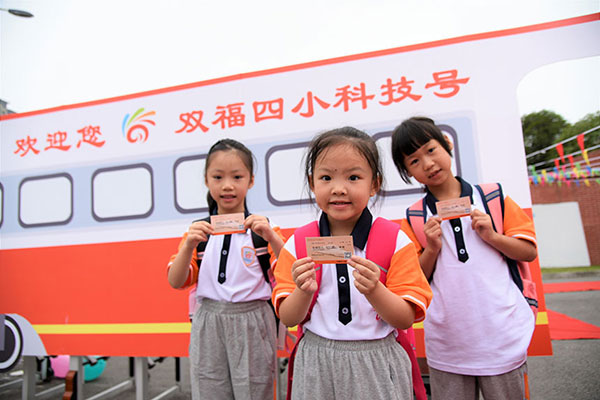 在江津雙福四小,新生們從老師手中領取一張科技號列車的車票,踏上列車。此趟列車途經匯融站、涵品站、慧智站三個車站,幫助學生了解校園文化。