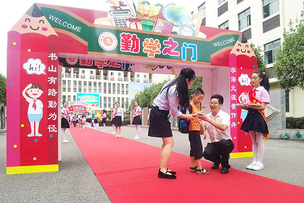 向陽小學340名一年級新生參加開學典禮,獲贈《向陽君子規》和象征學校文化的向陽花。隨后,在家長的陪伴下跨過啟蒙之門、啟德之門、啟智之門,正式成為小學生。