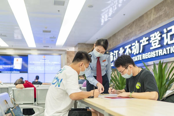 重慶市江北區第四稅務所工作人員在江北不動產登記中心輔導房屋交易雙方填寫契稅減免相關信息采集表格。郭睿攝
