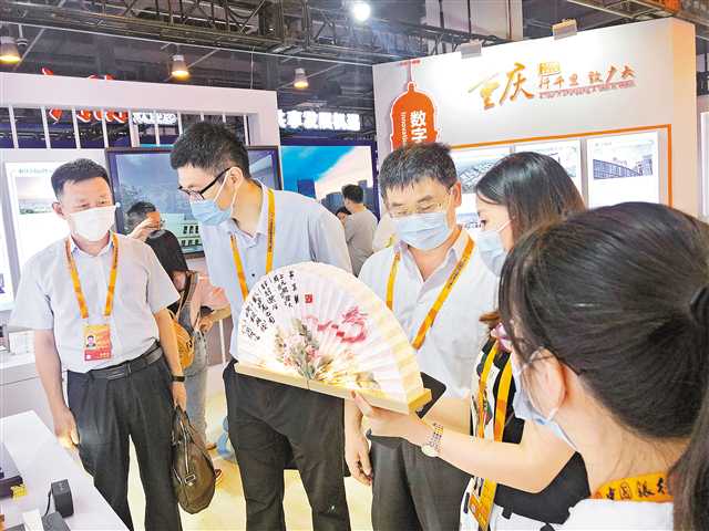 9月3日,2021服貿會現場,重慶展臺吸引了不少參觀者。本次服貿會重慶展廳集中展示了全市投資環境、國際物流、數字貿易、文化旅游、工程技術、生物醫藥等領域新面貌新成就。(市商務委供圖)