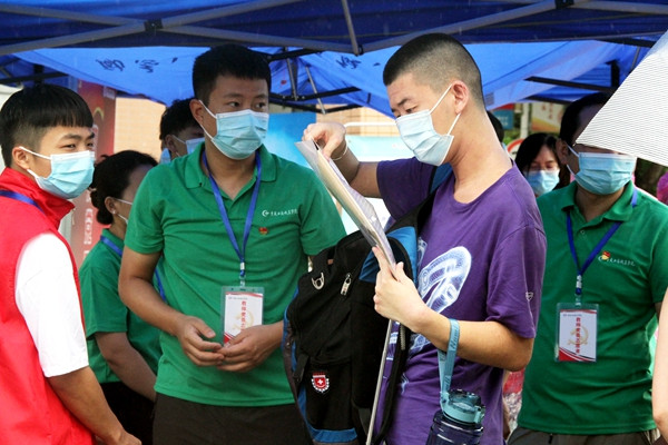 人民網重慶9月9日電 “請各位同學保持1米以上間距有序排隊,在通道入口處測溫、消毒……”迎新期間,重慶工商職業學院在兩校區各迎新點設立黨員教師志愿服務崗,由85名黨員教師組建成的志愿服務隊,精準對接師生服務需求、筑牢校園疫情防控堅固防線,成為迎新現場一道靚麗的“綠色”風景線。