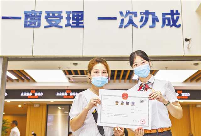 6月24日,在重慶高新區政務服務和社會事務中心辦事大廳,市民姚女士從工作人員手中領到了全國首張整合衛生許可信息的“一碼通行”營業執照。(資料圖片)記者 張錦輝 攝/視覺重慶