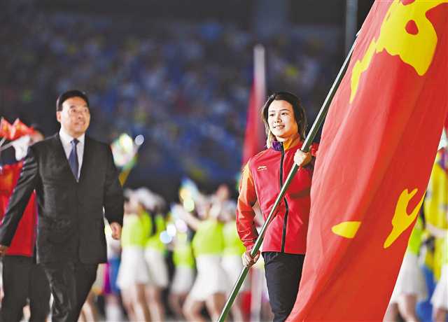 9月15日,重慶市體育代表團旗手施廷懋在入場儀式上。新華社發
