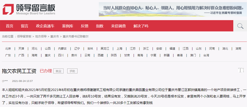 在嚴女士首次留言中說到:“姐姐和姐夫自2021年5月初至2021年8月初在位于重慶市綦江區郭扶鎮高廟的一個地產項目做裝修工,一共工作近3個月,只發了兩千多元就讓工人回去等,說8月10號發,過了20號也沒發。家里有兩個小孩和老人要用錢,馬上開學了,希望領導幫我們討回工資!