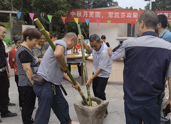 人民網重慶9月17日電 17日下午,渝北區玉峰山鎮石坪社區玉坪雅居熱鬧非凡。原來是當地以競賽的方式,在小區內開展中秋佳節傳統民俗打糍粑活動;顒又,退役軍人、老黨員、志愿者等紛紛參與,齊心協力將熱氣騰騰的糯米變成一個個團團圓圓的糍粑,并送到群眾的手上。