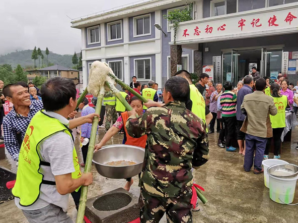 活動中,村民們與干部們或兩人一組、或三人一團,圍著石舂,快速而賣力地打起了糍粑。短短10多分鐘,熱氣騰騰的糍粑就大功告成,干部們一一分裝,并加入黃粉和白糖,隨后與居民一起開心享用這一傳統美食。