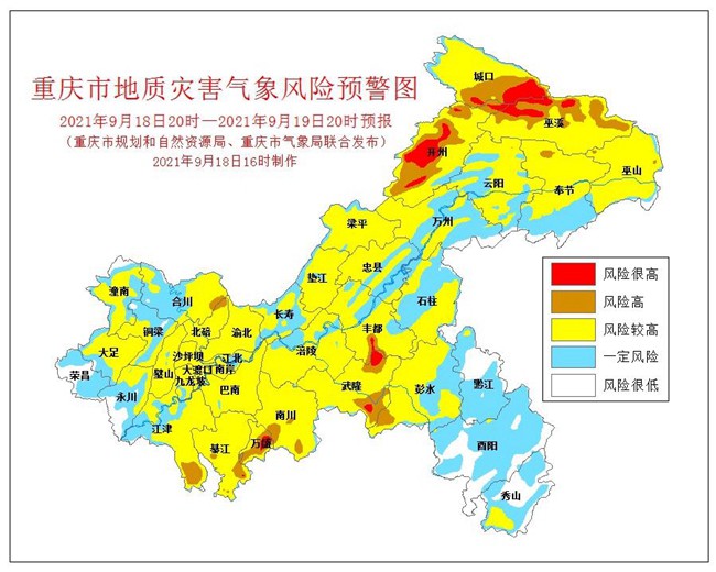 9月18日20時至9月19日20時,武隆區、巫溪縣、開州區、城口縣、豐都縣、萬盛經開區屬于風險很高地區,地質災害氣象風險等級為一級(紅色預警),江津區、綦江區、彭水縣、合川區、北碚區、南川區、奉節縣屬于高風險地區,地質災害氣象風險等級為二級(橙色預警),大足區、秀山縣、梁平區、潼南區、銅梁區、璧山區、永川區、渝北區、萬州區、石柱縣、忠縣、長壽區、墊江縣、涪陵區、南岸區、渝中區、江北區、巫山縣、云陽縣、巴南區、黔江區、兩江新區、大渡口區、沙坪壩區、九龍坡區屬于風險較高地區,地質災害氣象風險等級為三級(黃色預警),酉陽縣、榮昌區屬于一定風險地區,地質災害氣象風險等級為四級(藍色預警)。