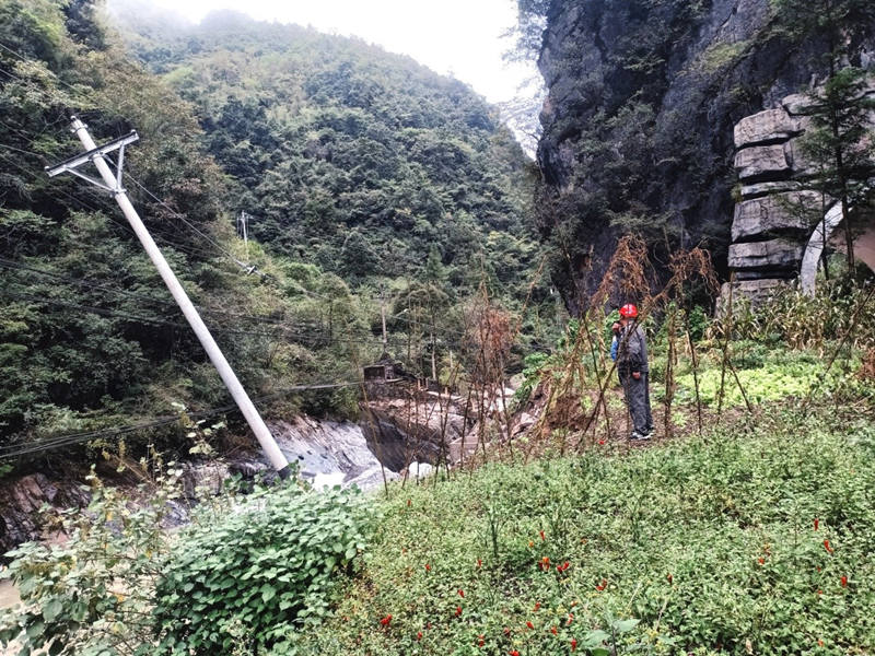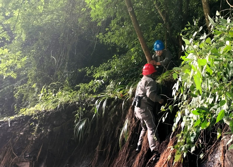 暴雨瓢潑,山路崎嶇,20日凌晨,該公司工作人員抵達東安鎮。由于持續強降雨,前往受災現場的道路已毀,工作人員穿好雨具,背上工器具,從幾乎垂直的斷崖上徒手攀登,越過倒塌的樹木,在泥濘的山路中一深一淺地開展線路巡視工作。