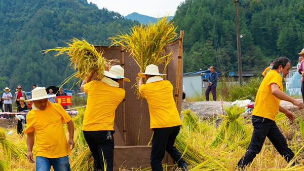農民收割稻谷趣味比賽現場。奉節宣傳部供圖
