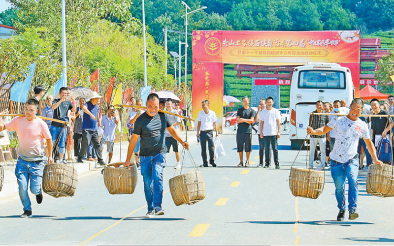 9月23日,秀山縣現代農業科技展示館廣場,農民運動會上,選手們進行挑擔比賽。通訊員 魯詩勤 攝/視覺重慶
