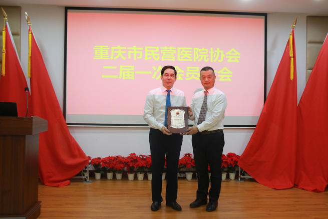 重慶市民營醫院協會秘書長戴軍(左)向協會總顧問、重慶市醫師協會會長趙興吉授牌。劉香瑩攝