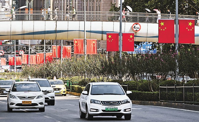9月26日,沙坪壩區鳳天大道掛滿鮮艷的五星紅旗。連日來,越來越多的國旗出現在我市街頭、商圈、景區,喜迎國慶的氛圍濃郁。特約攝影 孫凱芳/視覺重慶