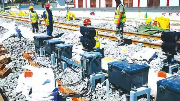 施工現場,40多名工人各司其職,在存車場里進行線路上砟整道、搗固、軌道精調、線路消缺等施工作業,施工現場如火如荼。