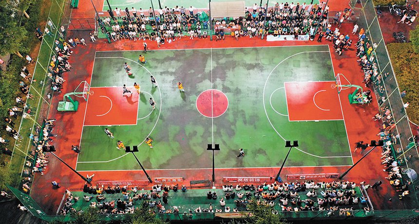 10月2日晚,梁平區全民健身中心旁的露天球場,市民參加籃球比賽。國慶假期,不少市民走進體育場所,跑步、踢足球、打籃球、打太極拳等,鍛煉身體,放松心情,愉快度假。特約攝影 劉輝/視覺重慶