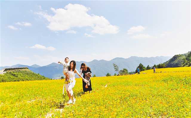 10月3日,游客在酉陽花田鄉何家巖村萬壽菊花海拍照游玩,賞花看景,樂享假期。 通訊員 邱洪斌 攝/視覺重慶