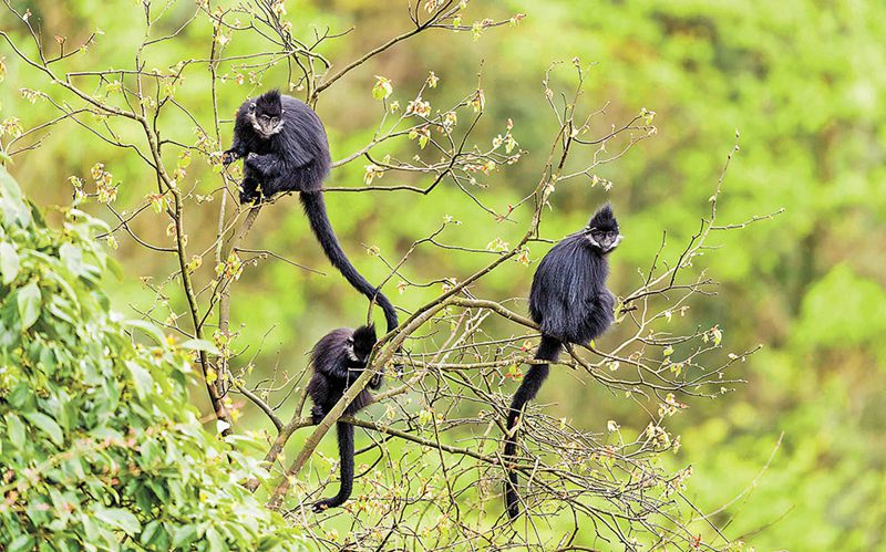 重慶是國家一級重點保護野生動物黑葉猴的全球分布最北界,金佛山國家級自然保護區聯合科研院校,開展黑葉猴種群遺傳多樣性水平、群體平衡程度、近交水平、生境保護等研究。對黑葉猴種群活動情況24小時動態監測顯示,其種群數量已從不足80只逐步恢復增長到現在的151只。