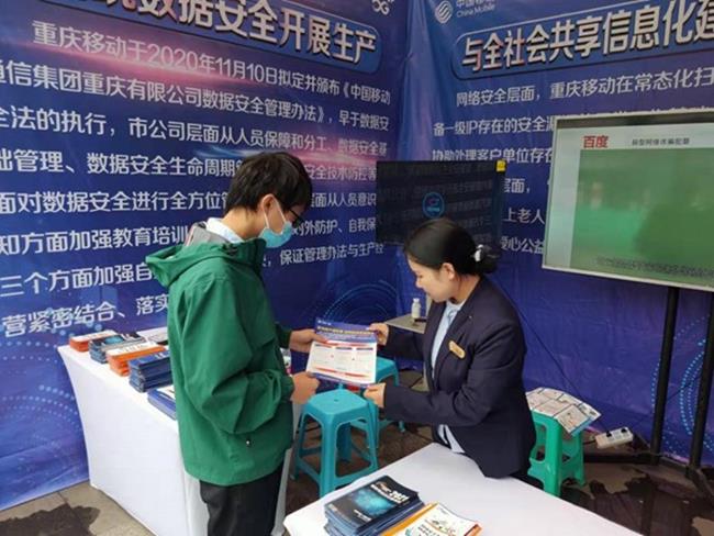 重慶移動工作人員向市民發放網絡安全知識宣傳頁。重慶移動公司供圖