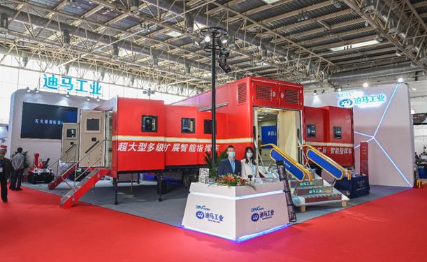此次展會上,集AI、5G通信、指揮調度、大型會議及后勤保障等功能為一體的超大型多級擴展智能指揮車是迪馬工業最新研發的產品。該產品可實現雙向三級側拉,展開面積高達100㎡,超大會議室可容納70余人,方艙的展開收回、地板自動找平可實現一鍵操作,多終端冗余控制。通過搭載迪馬自主研發的“前線應急指揮系統”“應急安全管理系統”“專用車智慧互聯系統”三大系統,產品行駛到目的地后,30分鐘內可完成方艙的展開調平,60分鐘內可完成艙內消防設備及輔助設施快速布置并開展消防救援工作,與旗下產品協同作戰,廣泛服務于公安消防、森林防火救災、醫療救援、部隊等領域,為各類重大災情的搶險救援提供系統解決方案。