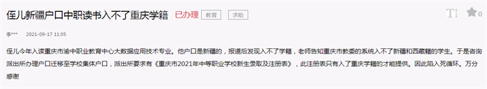 9月17日,李女士在首次留言中說到:侄兒今年入讀重慶市渝中職業教育中心大數據應用技術專業,由于戶口在新疆,去該校報道后發現入不了學籍。于是咨詢派出所辦理戶口遷移至學校集體戶口,派出所要求提供《重慶市2021年中等職業學校新生錄取及注冊表》,然而,該注冊表只有入了重慶學籍的才能提供。因此陷入死循環……
