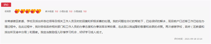 為表達感謝之情,李女士在人民網“領導留言板”上回復了感謝信,并給出“五星”好評:“在此過程中,我對各級政府相關部門和工作人員的辦事態度和辦事效率非常欽佩,在此致以我誠摯的敬意和由衷的點贊。我定當鼓勵侄兒珍惜學習機會,好好學習成人成才!”