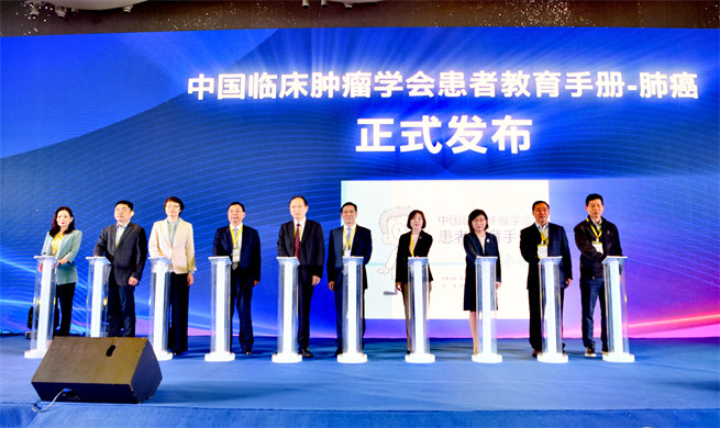 參會專家在年會上一同發布《患者教育手冊·肺癌》。曾理/攝