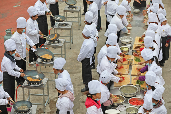 烹飪技術培訓現場,村民們正在練習各種烹飪技巧。趙勇攝