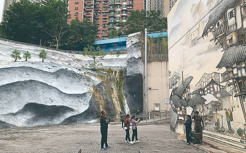 相比一側的山水畫,另一側的吊腳樓畫作更有一種生活和情懷。峭壁上,是一幅長高約為10米的巨型老重慶風貌畫,畫中有層層疊疊的吊腳樓,也有挑著扁擔走街的挑夫,還有坐在棚下喝茶休閑的人……看到這幅畫,滿滿的回憶感撲面而來。