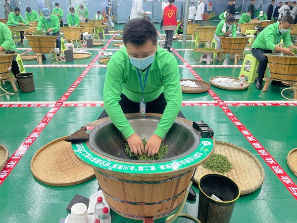 殺青、揉捻、做形、烘干……比賽現場,選手們聚精會神,使用來自永川的鮮茶葉為原材料,根據自己的思考制作出不同形狀、不同口感的茶葉。