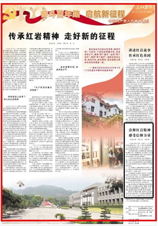 2019年4月17日,習近平總書記在重慶考察時指出:“重慶是一塊英雄的土地,有著光榮的革命傳統。毛澤東同志在這里進行了決定中國前途命運的重慶談判,周恩來同志領導中共中央南方局在這里同反動勢力展開了堅決斗爭,鄧小平同志在這里領導中共中央西南局進行了大量開創性工作。重慶涌現了大批大義凜然、高風亮節的共產黨人,如信仰堅定、不怕犧牲的趙世炎等人,英勇善戰、屢建功績的王良等人,堅貞不屈、永不叛黨的江竹筠、王樸、陳然等人,嚴守紀律、勇于犧牲的戰斗英雄邱少云,等等。解放戰爭時期,眾多被關押在渣滓洞、白公館的中國共產黨人,經受住種種酷刑折磨,不折不撓、寧死不屈,為中國人民解放事業獻出了寶貴生命,凝結成‘紅巖精神’。重慶要運用這些紅色資源,教育引導廣大黨員、干部堅定理想信仰,養成浩然正氣,增強‘四個意識’、堅定‘四個自信’、做到‘兩個維護’,始終在政治立場、政治方向、政治原則、政治道路上同黨中央保持高度一致!