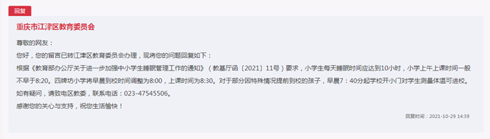 收到留言后,江津區教委回復:根據《教育部辦公廳關于進一步加強中小學生睡眠管理工作的通知》要求,小學生每天睡眠時間應達到10小時,小學上午上課時間一般不早于8點20。四牌坊小學將早晨到校時間調整為8點,上課時間為8點30。
