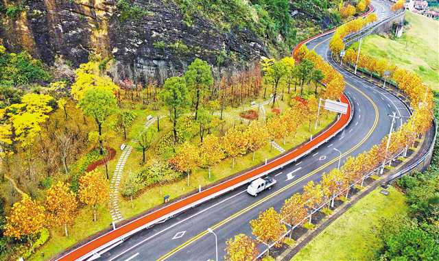 11月2日,汽車行駛在萬盛黑山鎮北門村鄉村公路上,兩側植被繁茂,秋色斑斕!〗陙,萬盛經開區大力推進美麗鄉村和“四好農村路”建設,開通“一元公交”客運村村通,將各行政村與外面的世界連起來,讓各個行政村和村民小組之間連起來,全域公交激活旅游,為農民增收致富創造了條件。