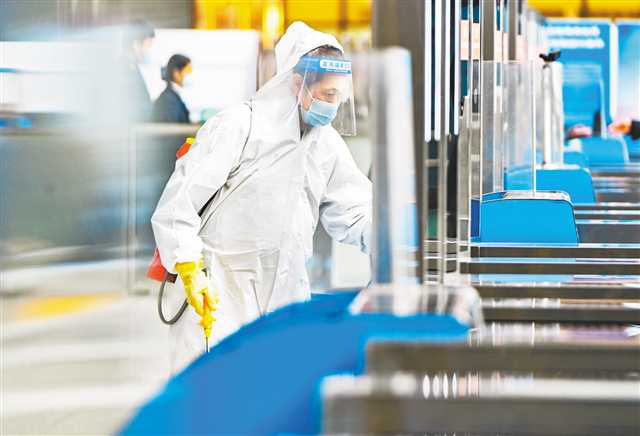 11月5日,重慶北站候車大廳,工作人員正在進行消殺。近期受多地疫情影響,鐵路部門停開、減開部分旅客列車。重慶各大火車站嚴格落實驗碼、測溫工作,并加密消殺頻次,每2小時對候車區、站臺、衛生間等部位進行消殺工作。黨員服務隊們也積極參與防控工作中,每半個小時就要前往大廳,宣傳防疫知識,提醒旅客戴上口罩,注意安全。首席記者 龍帆 攝/視覺重慶