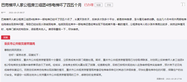 此外,重慶市公共租賃房管理局對北培區蔡家兩江名居小區C區4棟1號電梯故障影響出行的問題也進行了詳細說明,并督促北碚區公共保障住房中心立即開展維修工作,確保電梯盡快完成維修并恢復運行。