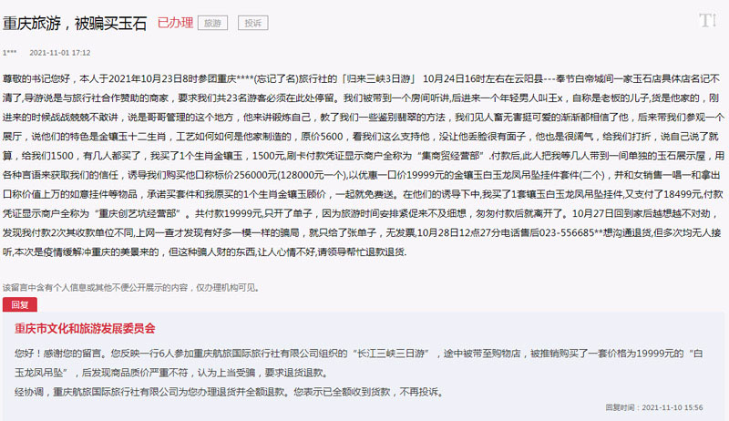 人民網重慶11月19日電 (陳琦)“我于上月參團重慶某旅行社組織的‘長江三峽三日游’期間,在云陽縣一家玉石店,被忽悠后花19999元購買了白玉龍鳳吊墜。因旅游時間緊促,來不及細想,匆匆付款后就離開了;氐郊液笤较朐讲粚,當時只給了收據,無發票。撥打售后電話想溝通退貨,但多次均無人接聽!苯,一名網友在人民網“領導留言板”投訴,其在三峽游玩期間,購買了價格虛高的玉石,希望相關部門能幫助其退貨。