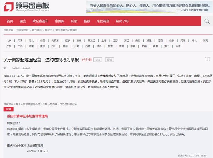 “今年3月,本人在渝中區雅美娜美容店參加1元祛痘體驗,該店主任、美容師趁機夸大我臉部皮膚不良狀況,給我制造‘美容焦慮’,讓我當月辦理了‘祛痘+排毒’套餐(1.568萬元)和‘私人訂制’套餐(12.8萬元)!11月16日,該網友在人民網“領導留言板”留言稱,她在治療5個月后,發現臉變得敏感,治療時出血嚴重,痘痘反復長無效果。希望相關部門進行查處,并退還其費用。