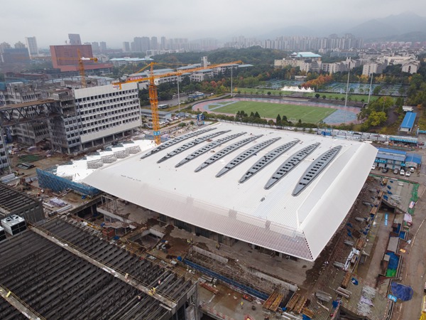 “體育中心項目主場館呈鉆石構造,屋蓋跨度為目前重慶高校體育場館之最,且類似張弦梁結構體系為目前重慶體育場館中首次應用!敝薪ò司种卮篌w育中心項目經理陳丁介紹,體育比賽區主場館已基本完成外立面幕墻施工,金屬屋面曲線的美感與外立面白色鋁方通的結合相得益彰。目前,主場館室內機電消防管線已基本完成,室內精裝修也在有序進行,地面墻面的鋪裝正在大面積展開。