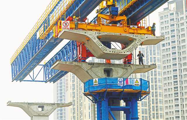 2021年3月22日上午,軌道十八號線金鰲山站——跳磴站區間首段拼裝梁順利起架。記者 羅斌 攝/視覺重慶