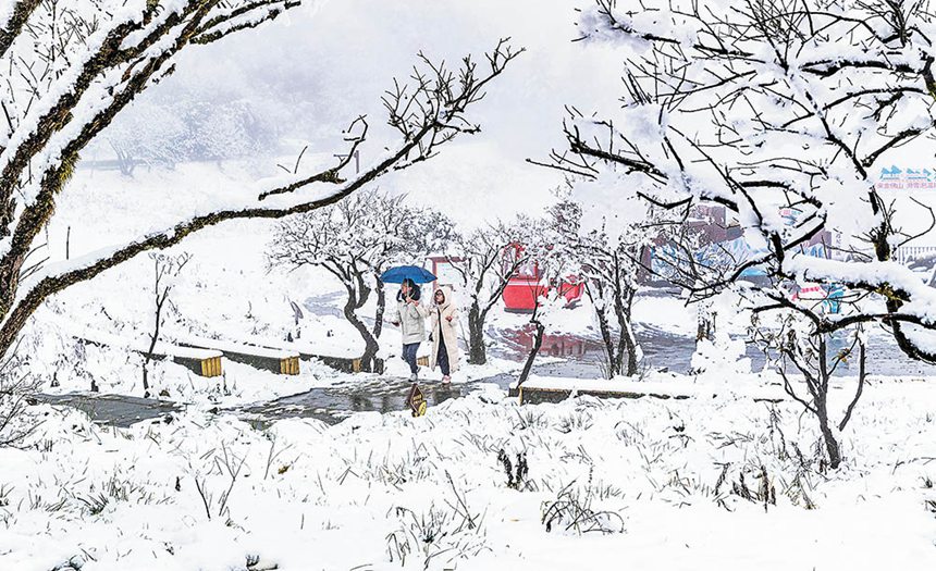 11月22日,南川區金佛山迎來降雪。當日,金佛山氣溫降到零攝氏度以下,雪花飛舞,游客可在銀裝素裹的世界里盡享雪中樂趣。特約攝影 瞿明斌/視覺重慶