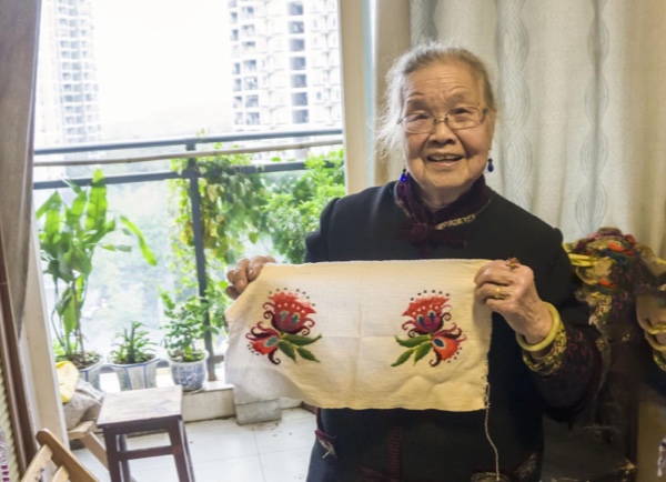 人民網重慶12月2日電 兩片竹框繃緊繡布、細毛筆勾出花樣、擘絲穿針……一臺舊式縫紉機前,年近九旬的周有玉正在專心完成一件花卉刺繡作品。