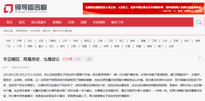 人民網重慶12月5日電 (陳琦)“感謝歇臺子派出所為我順利辦完落戶手續,讓一名軍轉干部剛回地方就感受到了滿滿的暖意,也為重慶的窗口辦事形象點贊!”近日,一網友通過“領導留言板”給重慶市市長留言表達感謝。感謝信中同時提到,辦事窗口為方便群眾應添置復印設施的建議,也得到了圓滿解決。