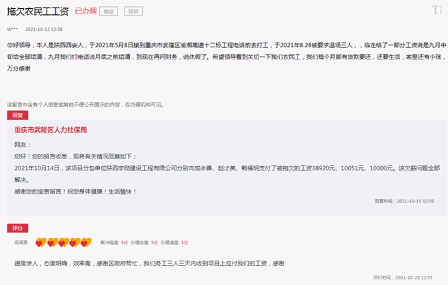 重慶市武隆區人力社保局回復: 2021年10月14日,該項目分包單位陜西宇勛建設工程有限公司分別向三人支付了被拖欠的工資38920元、10051元、10000元,該欠薪問題全部解決。感謝您的寶貴留言,祝您身體健康,生活愉快!