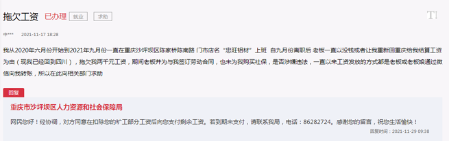 11月29日,重慶市沙坪壩區人社局回復:網民您好!經協調,對方同意在扣除您曠工部分的工資后向您支付剩余工資。若到期未支付,請聯系我局。感謝您的留言,祝您生活愉快!