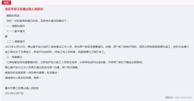 接到留言后,重慶市綦江區橫山鎮人民政府立即安排有關部門解決此事。11月25日,橫山鎮平安辦組織三角電管站工作人員,前往網友家現場查看了情況。經查,網友家門前電桿傾斜,是因為路面硬化施工,施工單位為了方便挖機通行,將電桿拉線拆除,現硬化工程已完工。